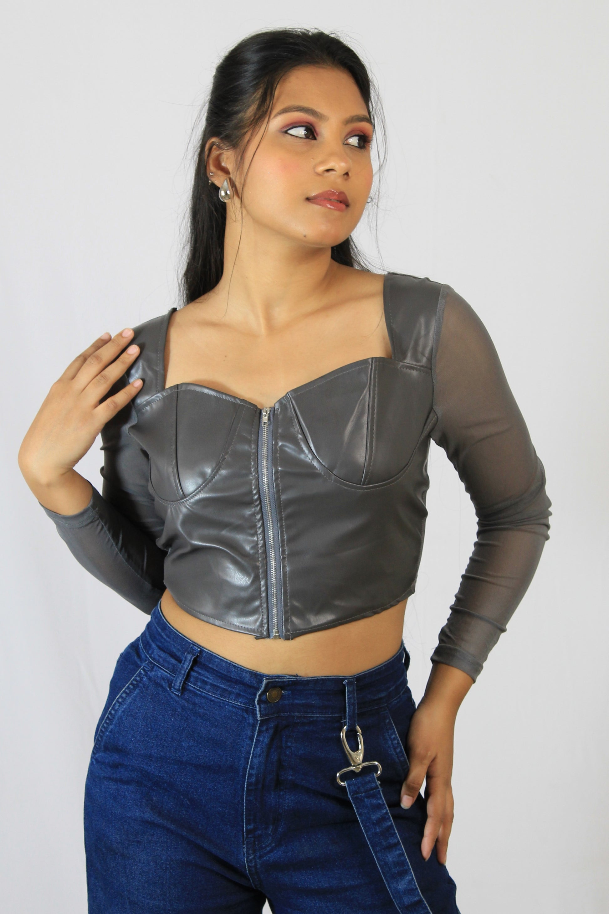 MAKE A BOLD STATEMENT WITH DOODLEWEAR'S GREY FAUX LEATHER CORSET TOP, FEATURING SHEER MESH SLEEVES AND A SLEEK FRONT ZIP. THIS PREMIUM, STRUCTURED CROP TOP IS DESIGNED FOR MODERN STREET STYLE, NIGHT OUTS, AND CONFIDENT EXPRESSION.